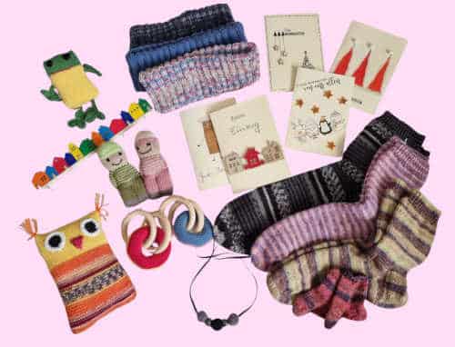 Zu den schönen Einzelstücken, Gestricktem, Handarbeiten, Glückwunschkarten und Deko gab es wieder Glühwein und Bratwurst und jede Menge gute Laune.