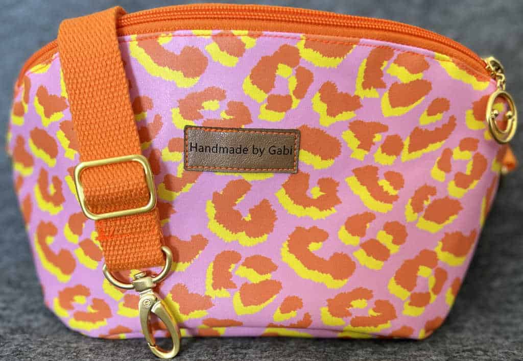 Ein echter Blickfang: Schöne Bauchtasche aus wasserabweisendem Stoff im bunten Leoprint (orange/pink)  mit den Maßen 25*8,5*14cm (B*T*H), ein passender Gurt in orange ist dabei. Passende Stücke finden Sie unter „264“.