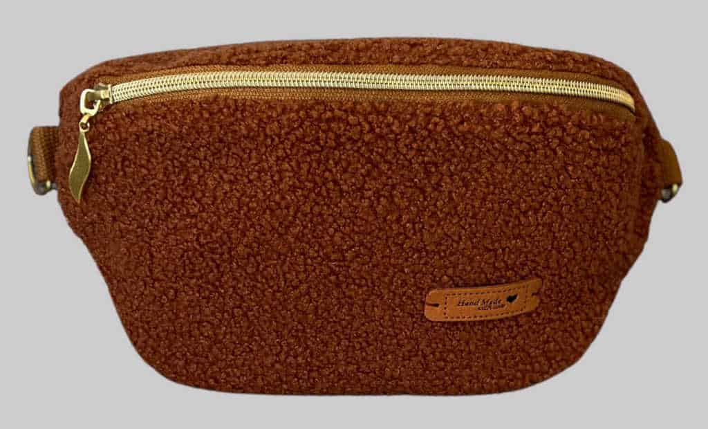Schöne Bauchtasche aus hellbraunem Teddystoff mit einem Reißverschluss in gold in den Abmessungen 25*8,5*14cm (B*T*H). Ein Gurt ist natürlich dabei.