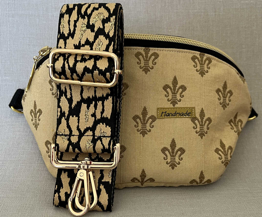 Ein echter Blickfang und elegant dazu: Schöne Bauchtasche aus robustem Stoff in beige mit goldfarbenem Dekor mit den Maßen 25*8,5*14cm (B*T*H), ein passender Gurt ist dabei.