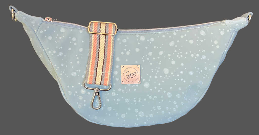Praktische Cross-Body-Tasche in Form einer Bauchtasche aus einem wasserabweisenden Stoff in hellem blau im regentropfendesign. Ein passender Gurt ist natürlich dabei und die Tasche kostet bei mir nur 35 €! Die Tasche hat ein Innenfach mit Reißverschluss und ist in der Größe von etwa 35*15*7 cm (B*H*T) gearbeitet. Passenden Stücke finden sie unter „578“.