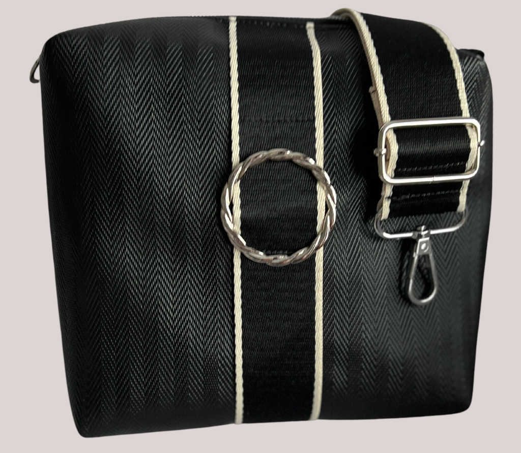 Schöne Handtasche nach dem Modell „Hillary“ in einer exklusiven und hochwertigen Ausführung aus schwarzem Kunstleder mit einem zum Design passenden Schultergurt.  Die Tasche hat eine Größe von 18*17*7 cm (B*H*T).