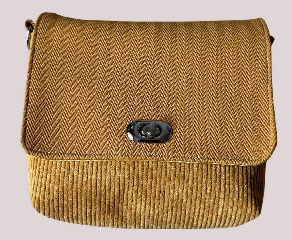Schöne Handtasche aus senffarbenem Cord mit einem Deckel im passenden Farbton aus Markisenstoff nach dem Modell „Holly“. Passende Stücke finden Sie unter „227“.