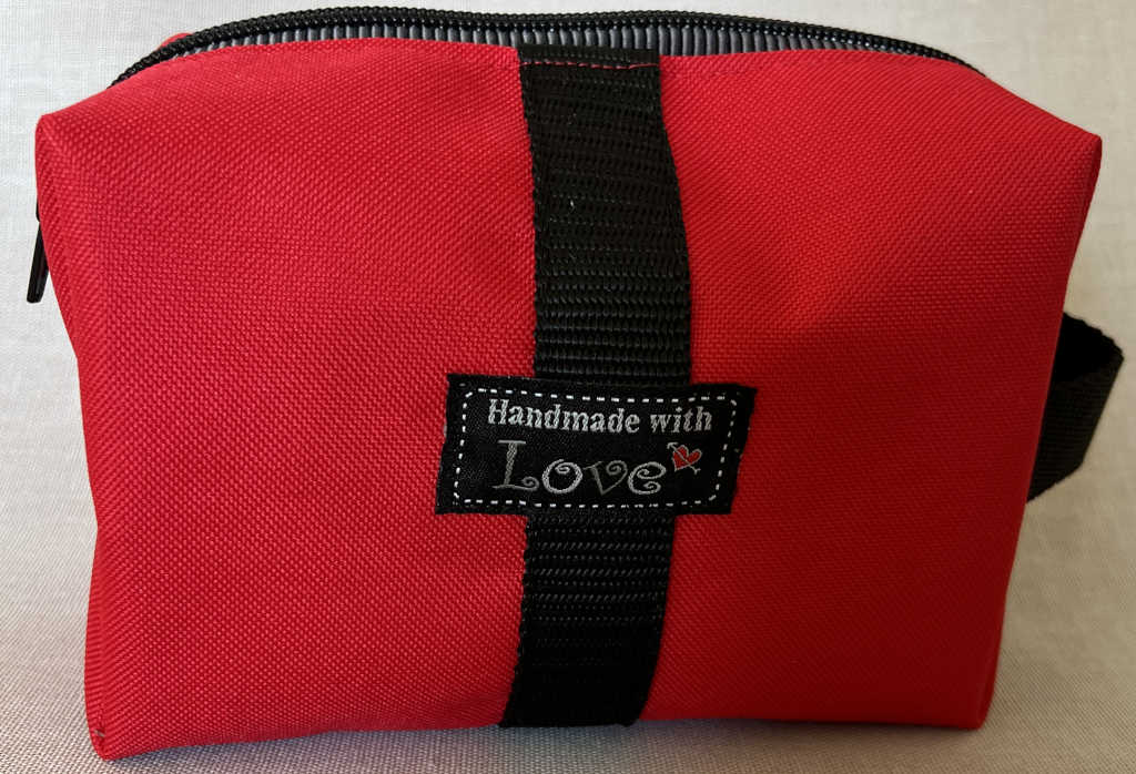 Kosmetiktasche im Modell „Karlchen“ (18*12*8cm (B*H*T)) in einem schönen, kräftigen rot mit markantem schwarzen Streifen in einem strapazierfähigen Outdoorstoff.