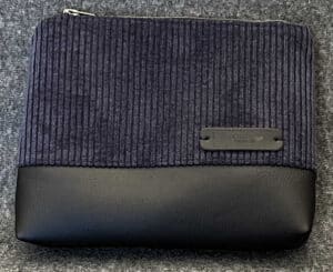 Kosmetiktasche aus dunkelblauem Cord und schwarzem Kunstleder.