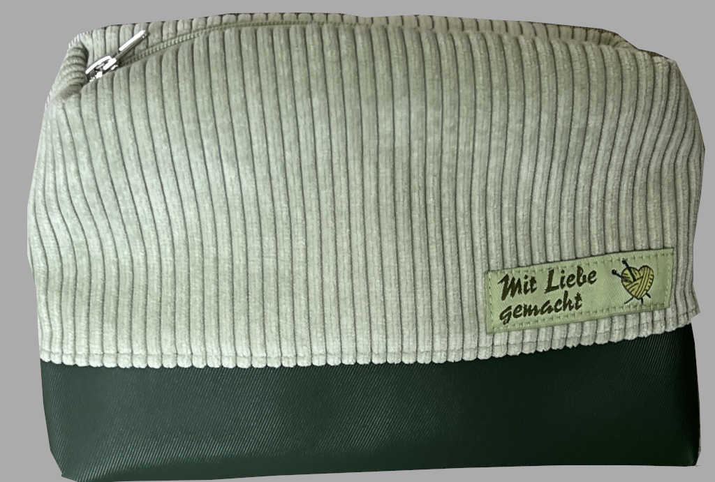 Kosmetiktasche aus Cord und Kunstleder in schönen Grüntönen. Passende Stücke finden Sie unter „726“.