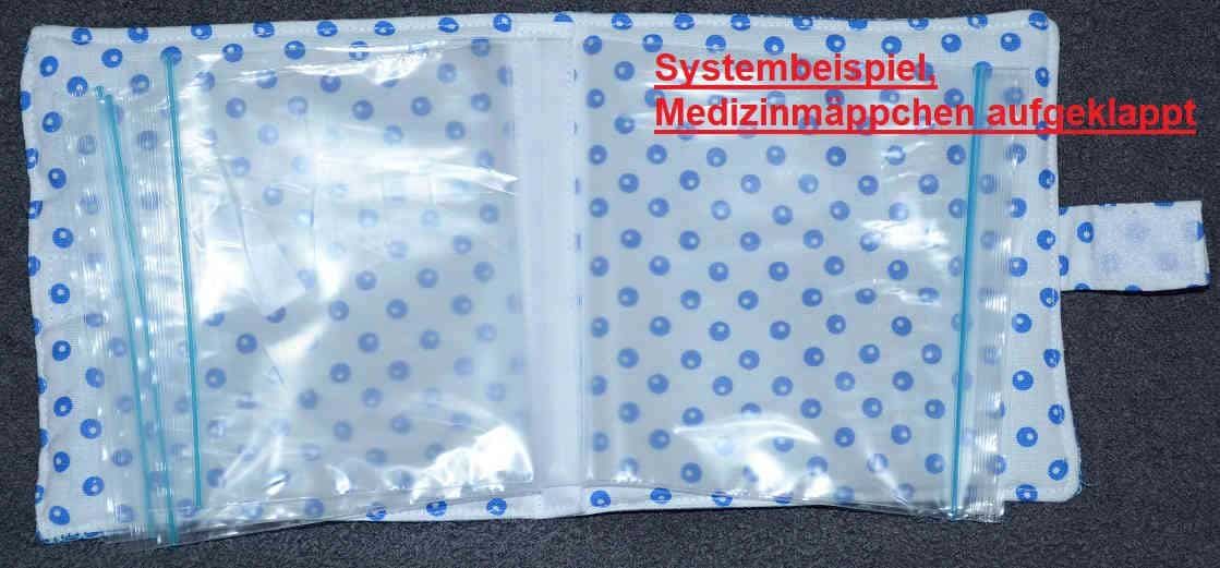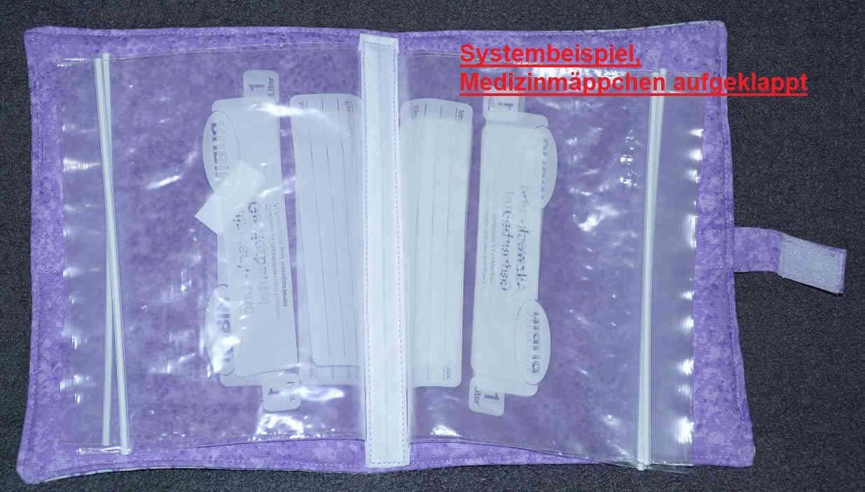 Hier ist lediglich ein Beispiel des „Innenlebens“ der Medi-Mäppchen dargestellt. Eingearbeitet sind jeweils 5 mit Zipper verschließbare Klarsichthüllen.