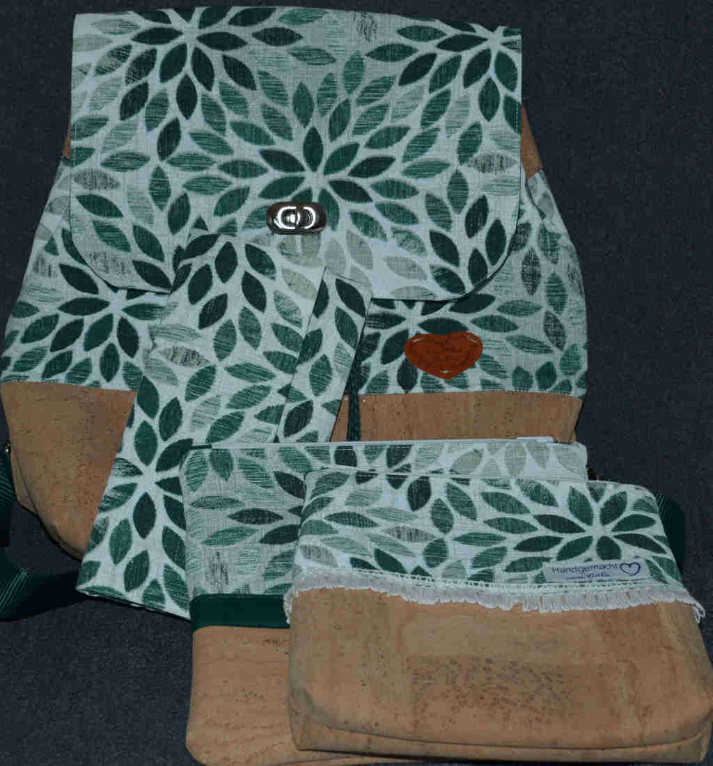 Set bestehend aus Rucksack, Bauchtasche, Portemonnaie und zwei unterschiedlichen Kosmetiktäschchen.
