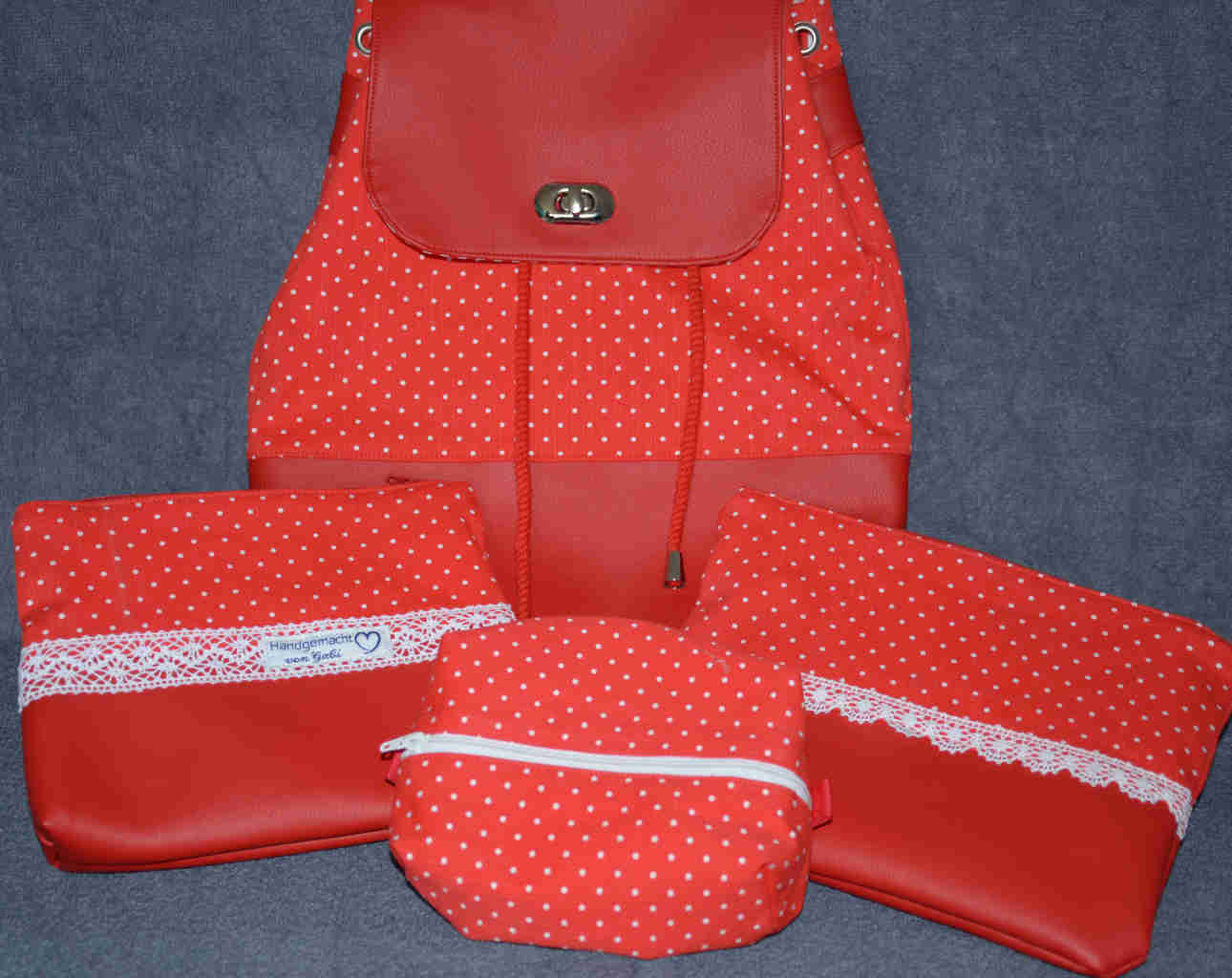 Set bestehend aus Rucksack, Portemonnaie und verschiedenen Kosmetiktaschen (suchen Sie nach „509“).
