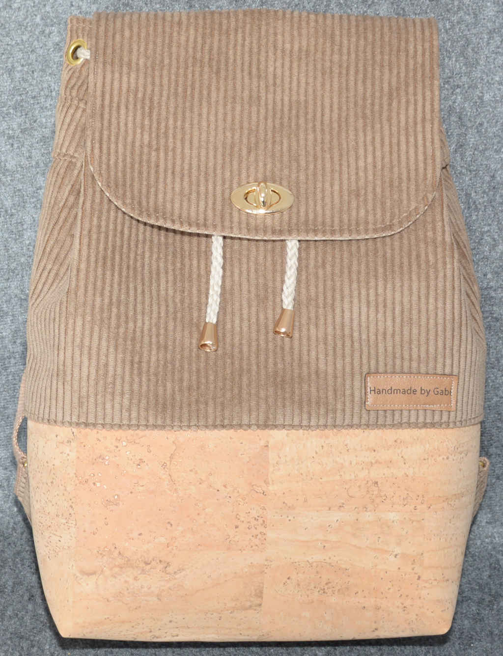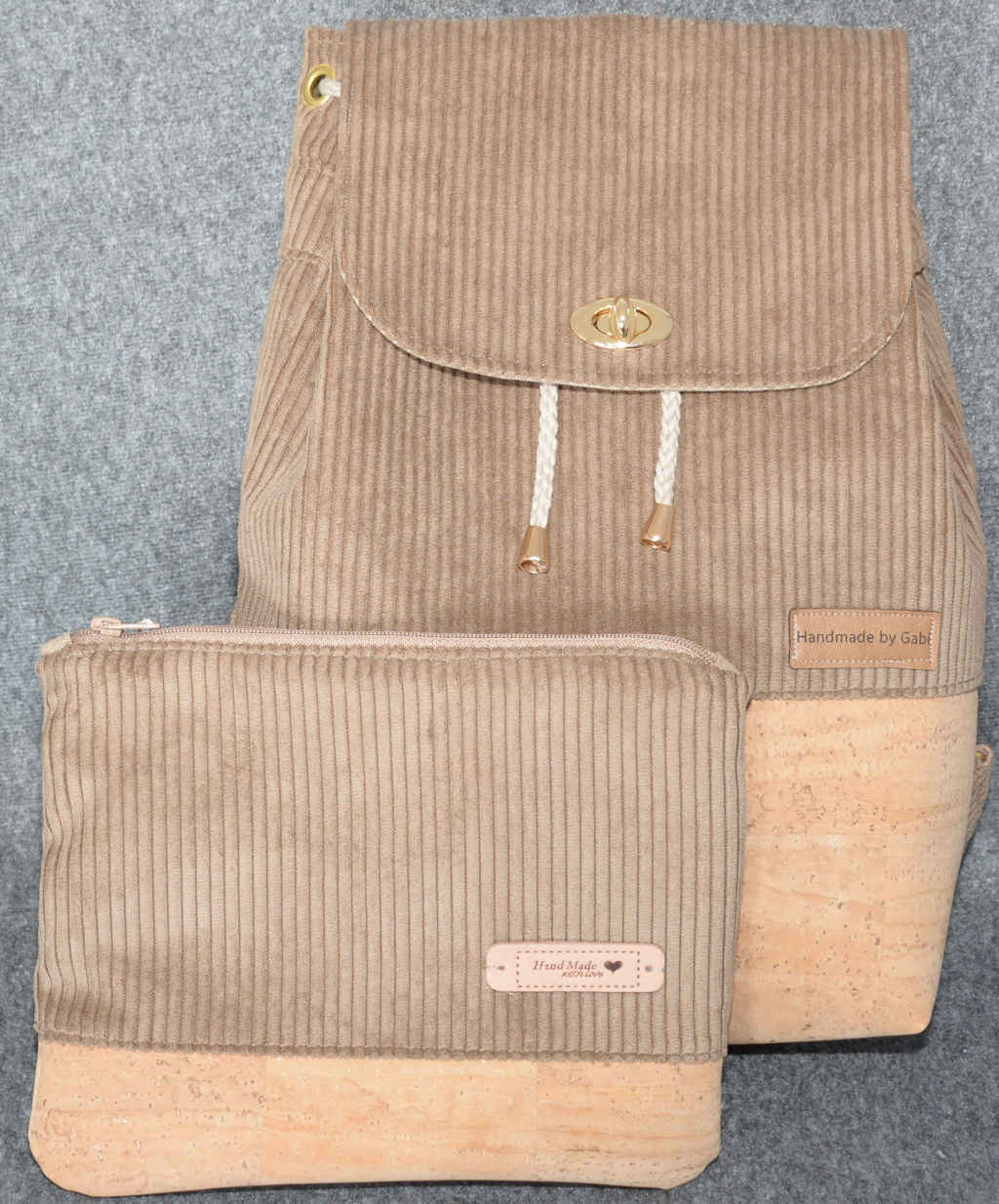 Hier sehen Sie ein Set aus einem Rucksack „Ronja“ und einer Kosmetiktasche aus Cord und Kork gearbeitet.