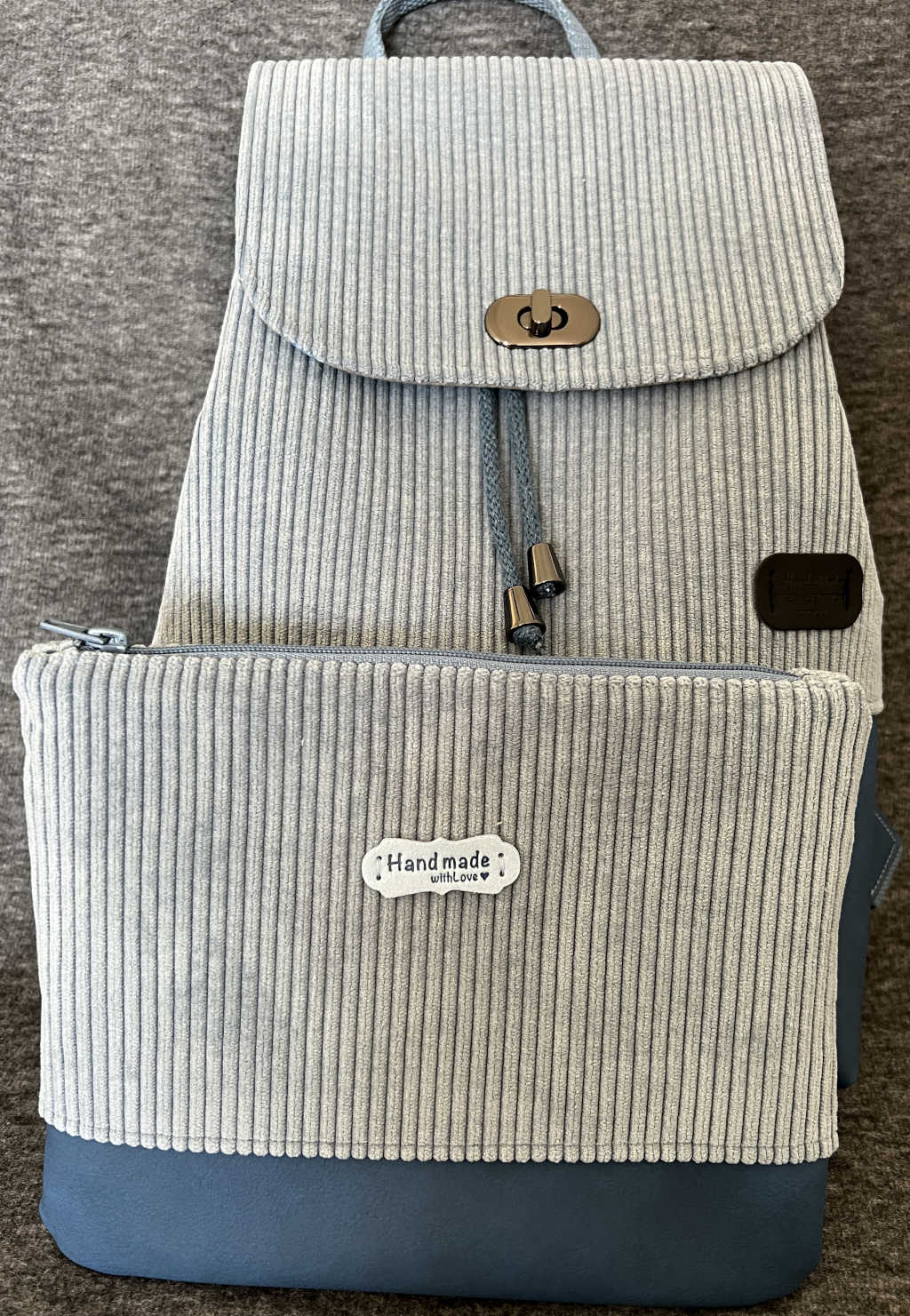 Hier sehen Sie ein Set aus einem Rucksack „Ronja“ und einer Kosmetiktasche aus Cord und Kunstleder in schön abgestimmten Blautönen (blau-grau/mittelblau).
