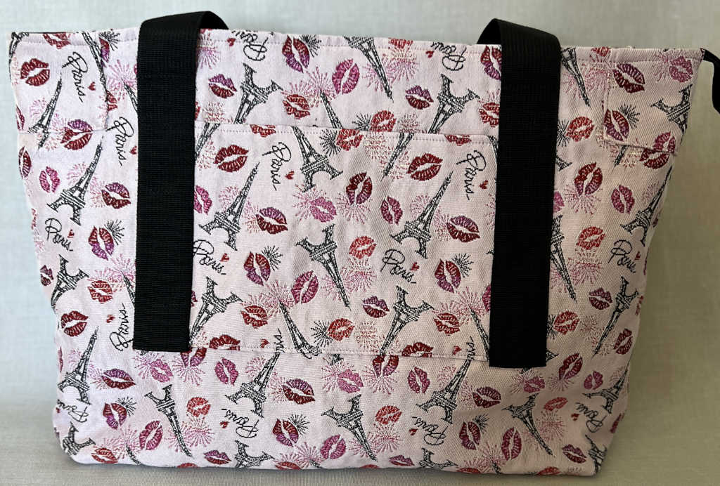 Schöne Tasche im Shopper-Format aus rosafarbenem Stoff und einem Muster im Paris-Style (Kussmund und Eifelturm). Die Tasche hat eine Größe von etwa 41*29*10 cm (B*H*T). Oben ist sie mit einem Magnetknopf zu schließen. Innen gibt es zwei zusätzliche Fächer, eines davon durch Reißverschluss zu schließen.