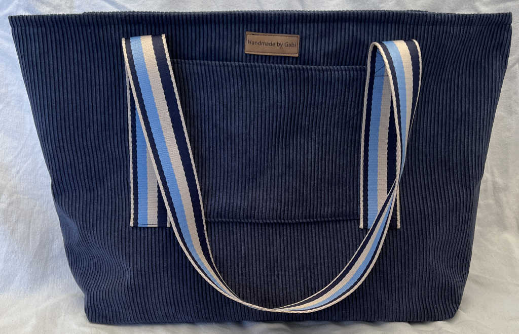 Schöne Tasche im Shopper-Format aus dunkelblauem Cord. Die Tasche hat eine Größe von etwa 41*29*10 cm (B*H*T). Oben ist sie mit einem Reißverschluss zu schließen. Außen hat sie an der Vorderseite ein aufgesetztes Fach und innen ein weiteres durch Reißverschluss zu schließendes.