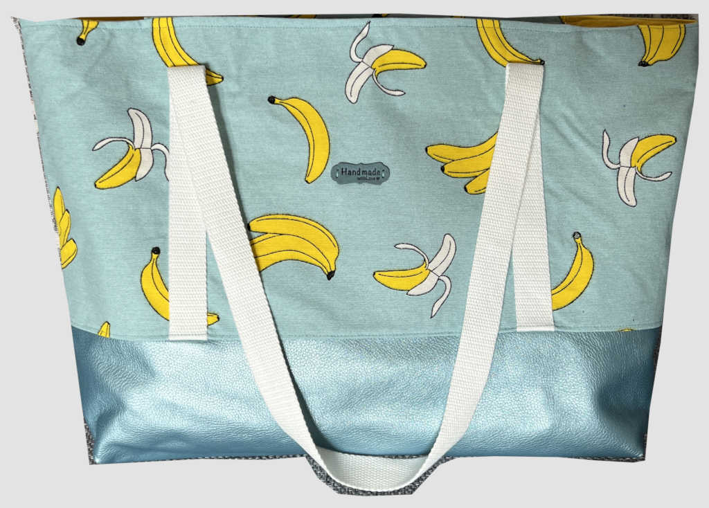 Schöne Tasche im Shopper-Format aus strapazierfähigem Stoff in einem schönen bunten Design in hellblau mit Bananen und einem Kunstlederboden. Die Tasche hat eine Größe von etwa 41*29*10 cm (B*H*T). Oben ist sie mit einem Reißverschluss zu schließen und es gibt ein außen aufgesetztes Fach und zwei Innenfächer, eines davon mit Reißverschluss geschützt.