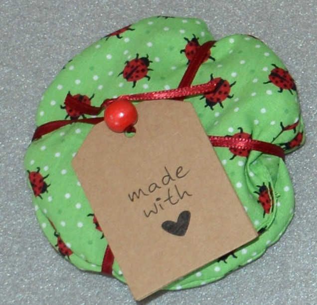 Diese Taschenwärmer (ein Paar) im Design für Kinder  sind rund (ca. 8,5 cm Durchmesser) und haben eine Getreidefüllung (Roggen, ca. 40 Gr. je Stück).