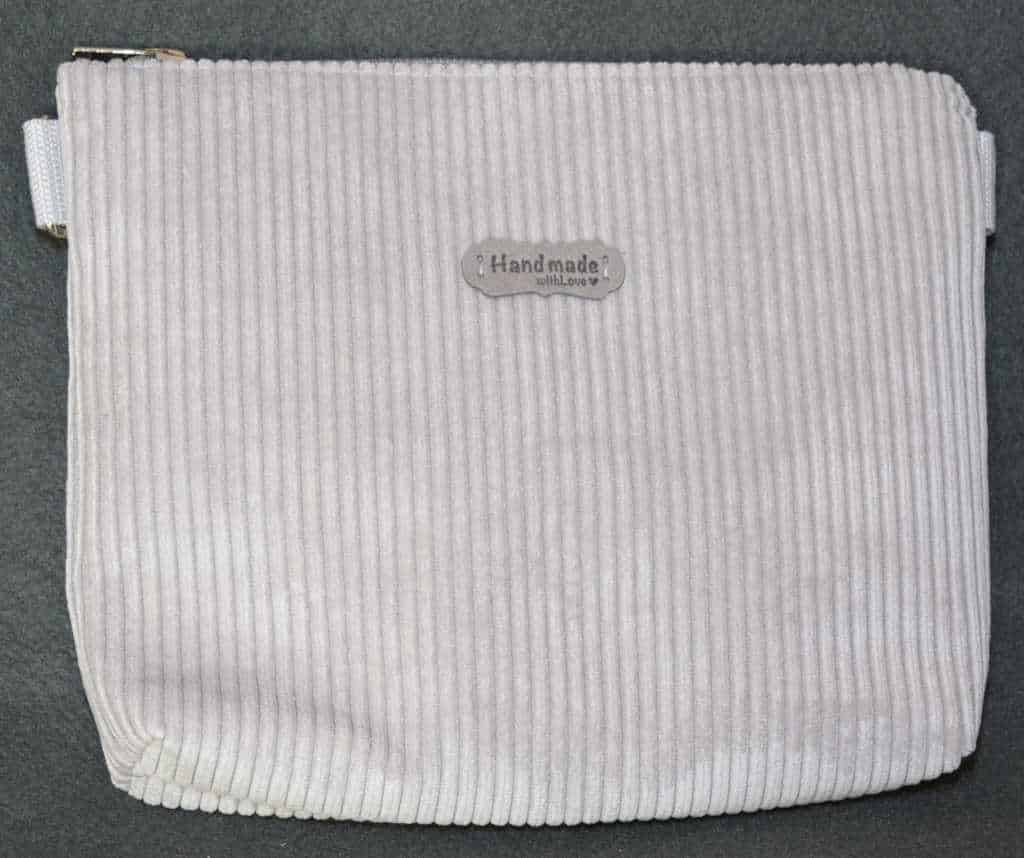 Umhängetasche aus hellgrauem Cord, die am Gurt über die Schulter oder auch Cross-Body getragen werden kann. Diese Tasche ist im Querformat gearbeitet. Sie ist etwa 22*18 cm (B*H) und 4cm tief.