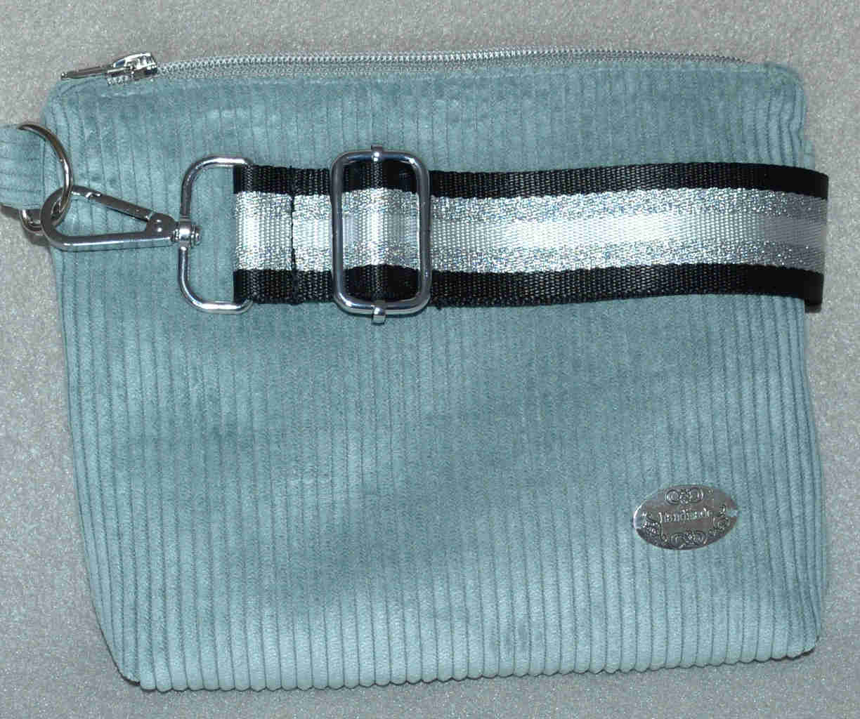 Umhängetasche, die am Gurt über die Schulter oder auch Cross-Body getragen werden kann. Diese Tasche ist im Querformat gearbeitet. Sie ist etwa 22*18 cm (B*H) und 4cm tief.