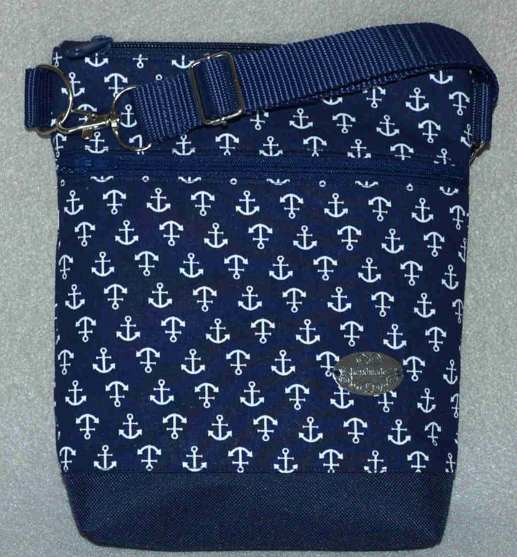 Umhängetasche, die am Gurt über die Schulter oder auch Cross-Body getragen werden kann. Diese Tasche ist im Hochformat gearbeitet. Sie ist etwa 18*22 cm (B*H) und 4cm tief.