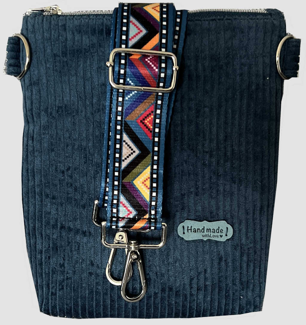 Umhängetasche aus dunkelblauem Cord, die am Gurt über die Schulter oder auch Cross-Body getragen werden kann. Diese Tasche ist im Hochformat gearbeitet. Sie ist etwa 18*22 cm (B*H) und 4cm tief. Und ein Gurt ist natürlich dabei. Passende Stücke finden Sie unter „236“.