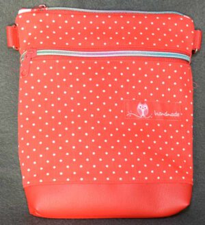 Umhängetasche aus rotem Stoff mit weißen Punkten und einem Boden aus rotem Kunstleder, die am Gurt über die Schulter oder auch Cross-Body getragen werden kann. Diese Tasche ist im Hochformat gearbeitet. Sie ist etwa 18*22 cm (B*H) und 4cm tief. Und ein Gurt ist natürlich dabei. Im gleichen Design gibt es weitere Artikel (suchen Sie nach „509“).