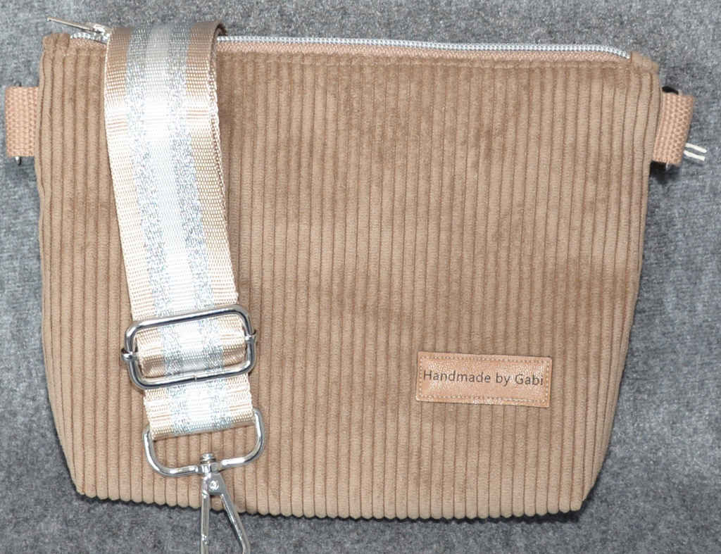 Umhängetasche, die am Gurt über die Schulter oder auch Cross-Body getragen werden kann. Diese Tasche ist im Querformat gearbeitet. Sie ist etwa 22*18 cm (B*H) und 4cm tief.