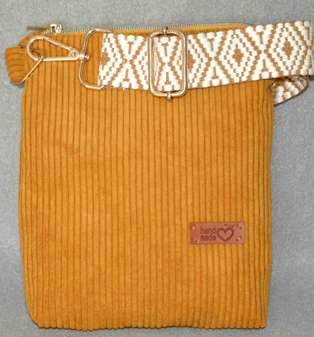 Umhängetasche, die am Gurt über die Schulter oder auch Cross-Body getragen werden kann. Diese Tasche ist im Hochformat gearbeitet. Sie ist etwa 18*22 cm (B*H) und 4cm tief.